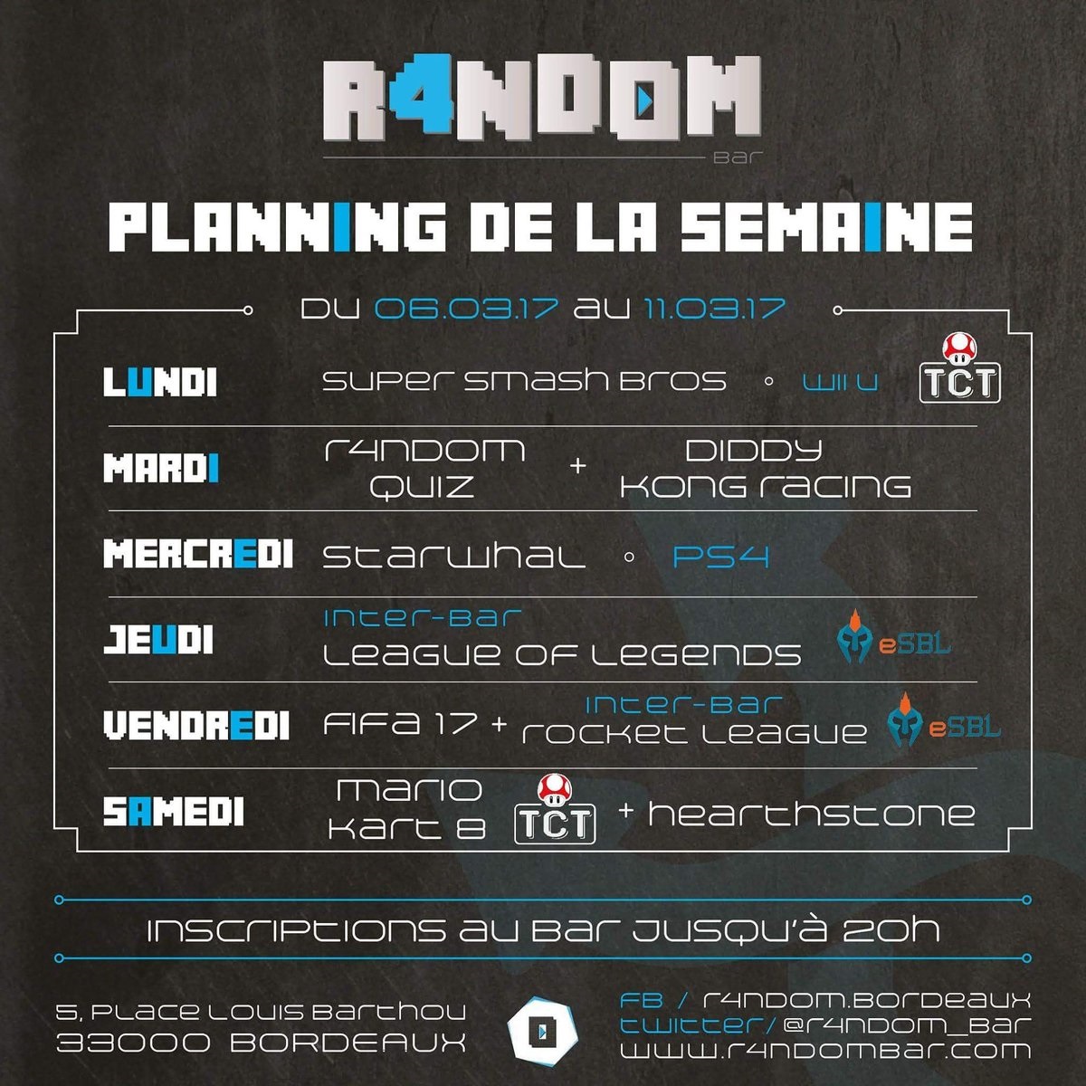 Afin d’apporter notre soutien au Bar R4ndom, vous pouvez retrouver ci-dessous le planning du Bar qui propose chaque soir des tournois.