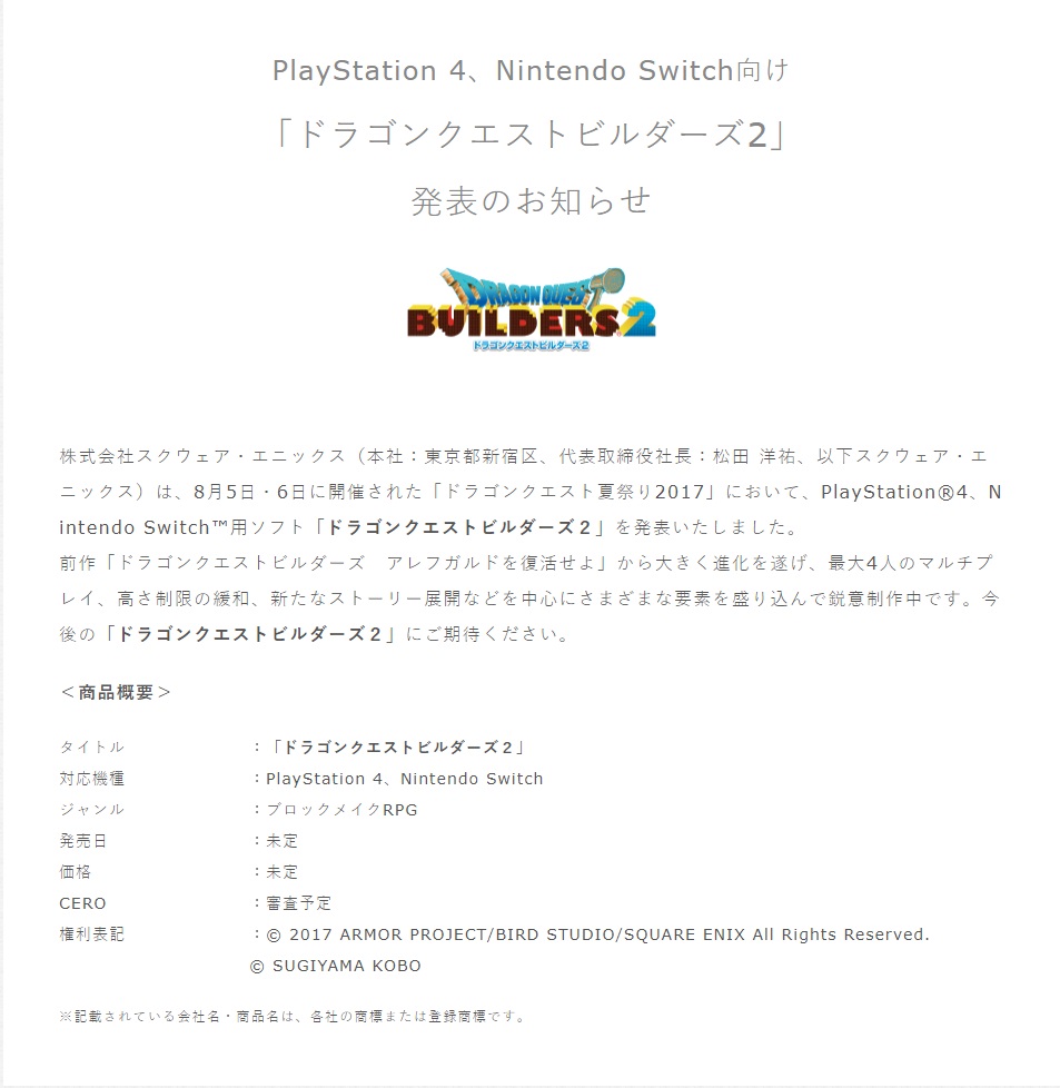 Square Enix a annoncé hier lors du Dragon Quest Summer Festival 2017 à Tokyo, l’arrivée du prochain titre Dragon Quest Builders 2 sur PlayStation 4 et Nintendo Switch.