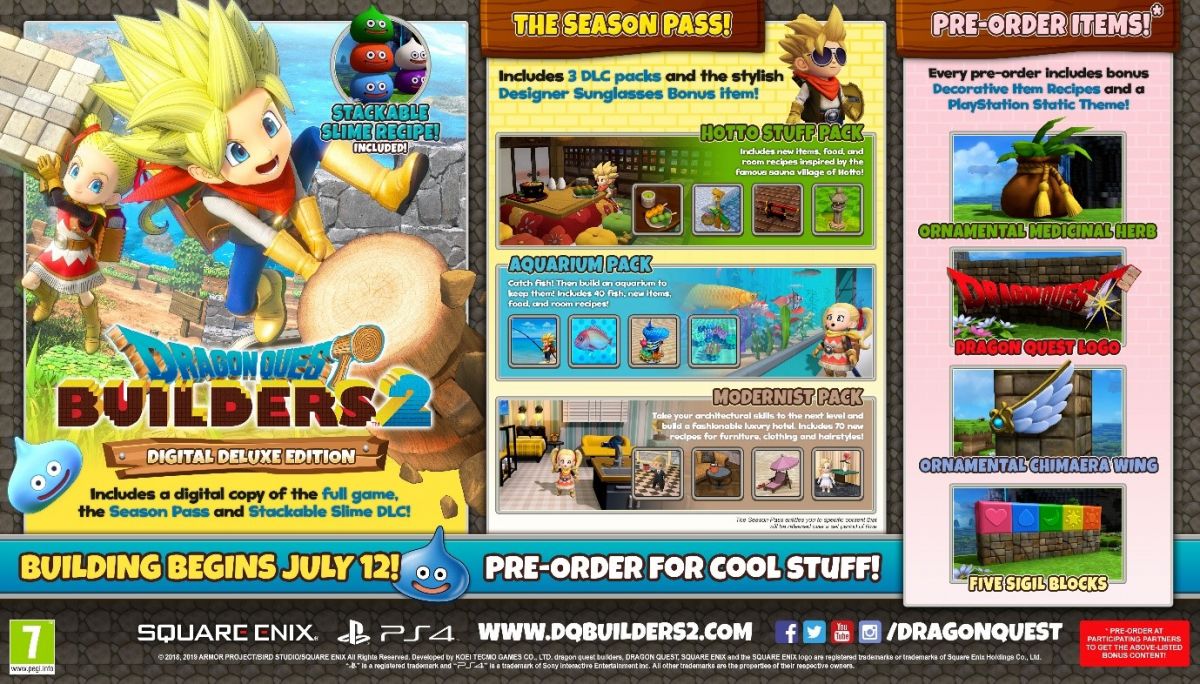 Dragon Quest Builders 2 propose plusieurs bonus pour tous les joueurs qui précommandent le jeu, ainsi que pour les possesseurs du jeu original Dragon Quest Builders et les abonnés PlayStation Plus.
