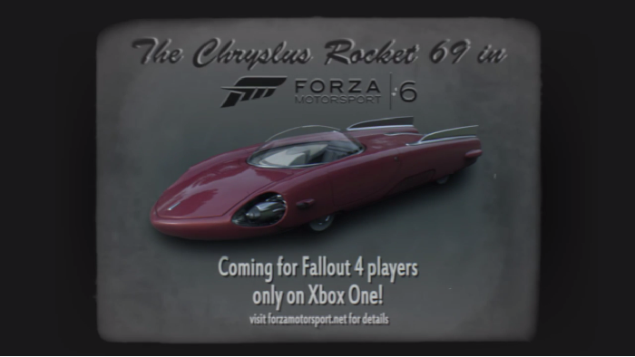 En effet, dans les jours qui arrivent nous allons voir débarquer sur Forza 6 un petit cadeau contenant une Ford F100 de 1956 toute bleue avec sur les portes et les ailes « une tête de Vault-boy jaune et la mention « Vault-Tec »», mais également une Chryslus Rocket 69 coupé, vous comprenez mieux maintenant pourquoi je vous parle Fallout 4 en début d’article.