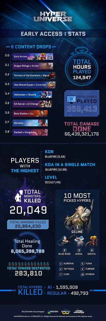 - Récompenses à la connexion : jusqu’à une semaine après le lancement, les joueurs qui se connectent à Hyper Universe et participent à un match régulier ou à un match IA recevront 30 Hyper cubes, 6 Hyper Coupons et 1 Hyper Skin Coupon.