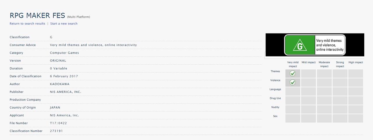 Parmi l’une des annonces, nous avons pu voir apparaître dernièrement des informations concernant un jeu qui a été classé sur le site AustralianClassification, : il s’agit de RPG Maker Fes qui est sorti le 24 Novembre 2016 au Japon. Ce qui veut dire que nous devrions voir le jeu apparaître lors de la présentation le 17 Février 2017.