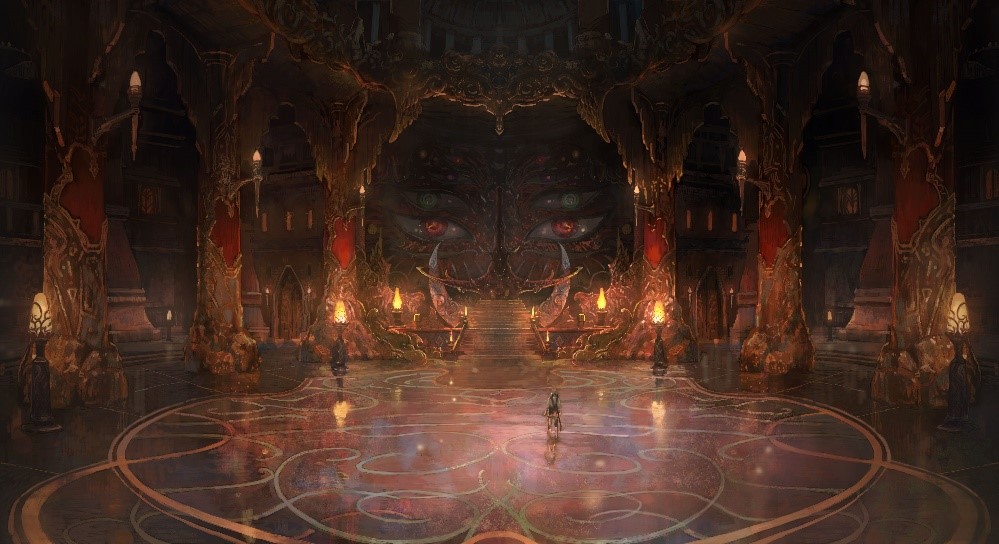 Dessinée par Oga Takeshi, concepteur d’arrière-plans, cette image représente le trône du Palais Ehir où réside la souveraine qui règne sur Szaka ainsi que sur le Royaume intérieur dans lequel l’histoire d’OninakI se déroule. Imprégné d’une atmosphère de majesté menaçante, ce trône a accueilli des générations de souverains incarnant les préceptes de la réincarnation. La souveraine actuelle est Lobelia.