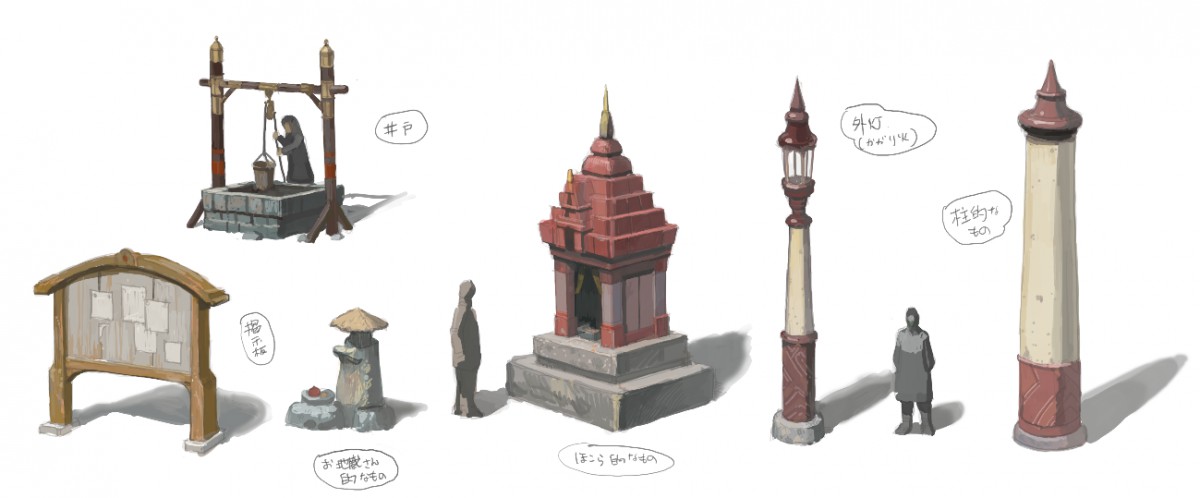 Les objets représentés ici proposent un aperçu de la vie des habitants du Royaume intérieur. De nombreuses influences asiatiques ont été incorporées dans le paysage urbain comme en témoignent les Piliers, et ces objets évoquant des sanctuaires shinto et des statues de Jizô bouddhiste. Le mélange de ces divers éléments donne aux rues de Szaka une atmosphère unique à mi-chemin entre Orient et Occident. Cette image a été dessinée par Oga Takeshi, concepteur d’arrière-plans.