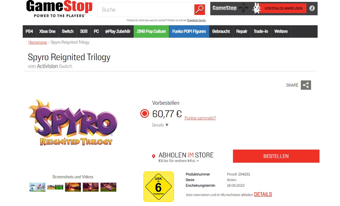 Alors que Crash Bandicoot N. Sane Trilogy vient à peine de sortir sur la console de Nintendo près de six mois après sa sortie initiale, Spyro Reignited Trilogy vient toquer à la porte de la Nintendo Switch et cela fut fuité par GameStop Allemagne.