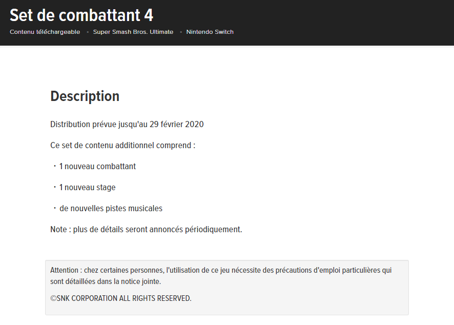En effet, les différents sites européens de Nintendo ont listé le « set de combattant 4 » et, dans celui-ci, on peut apercevoir la mention « SNK Corporation » en bas de la page. Bien évidemment, la firme nippone a décidé de fermer provisoirement cette dernière.