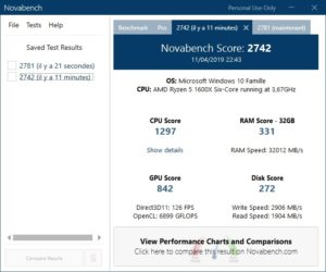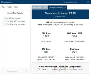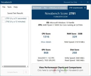 - Voici les résultats de Novabench effectués sur plusieurs intervalles : concernant le logiciel Novabench, c’est un utilitaire d’analyses comparatives pour Windows et Mac. Le programme teste les performances des composants informatiques et attribue des scores propriétaires, les scores les plus élevés indiquant de meilleures performances.