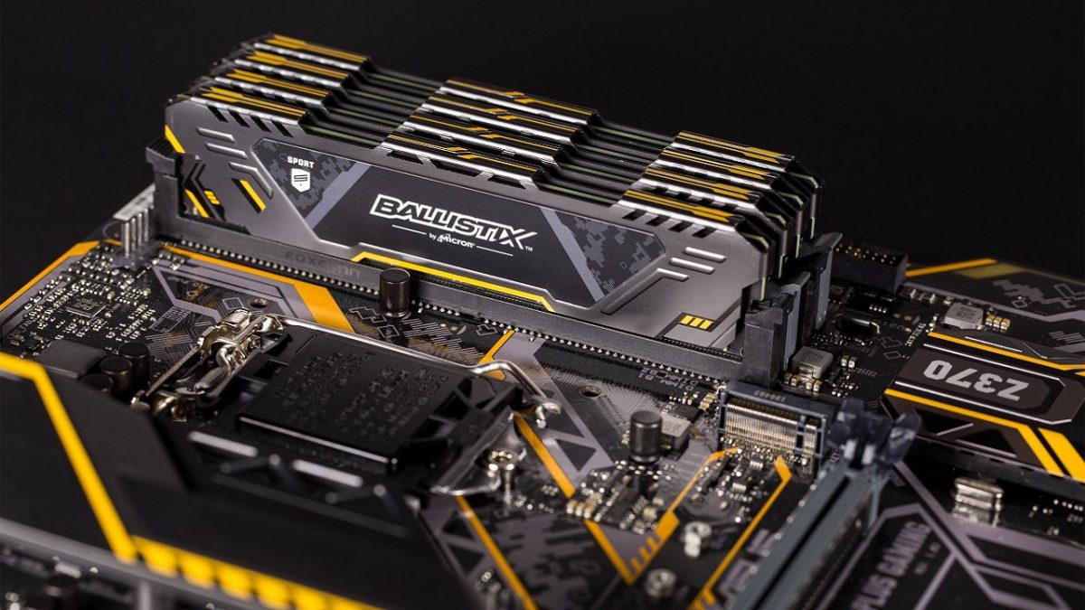 Le kit de mémoire Ballistix Sport AT DDR4 présente un design élégant avec des dissipateurs de chaleur en aluminium brossé gris foncé, certaines lignes de jaune et un circuit imprimé noir.
