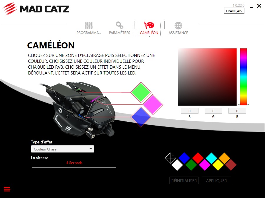 Le troisième onglet regroupe les réglages des jeux de lumière. Les effets s’appliquent aux LED sur la souris affectés à différentes zones de la souris. Vous pouvez également choisir une couleur parmi plus de 16 millions de couleurs.
