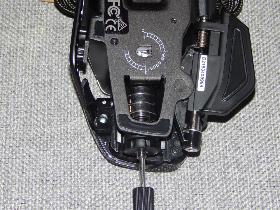 Visible depuis le dos de la souris et soigneusement cachée, une clé hexagonale est disponible pour effectuer des ajustements sur la souris :