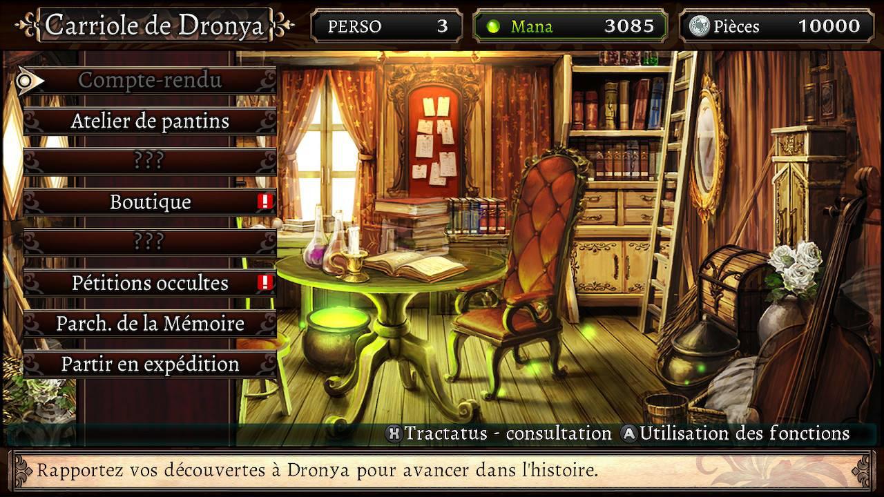Après une introduction mouvementée, nous nous retrouvons dans la Carriole de Dronia qui nous présente un menu avec un fond chaleureux nous permettant pas mal de chose ( l’objectif premier étant l’exploration de l’aventure ).