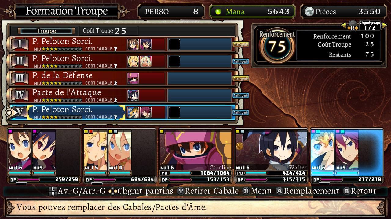 Une fois tous ces préparatifs effectués, vous ne serez pas encore prêt à explorer le Labyrinth of Refrain. Il vous faudra pour cela organiser vos pantins en Cabales (petits groupes armés avec différentes fonctions et bonus selon le parchemin utilisé) et enfin décider de leurs positions dans la petite armée que vous aurez créé (Arrière ou Avant garde, chaque classe ayant son lot de spécificités et facilités avec chaque position et armes disponibles).