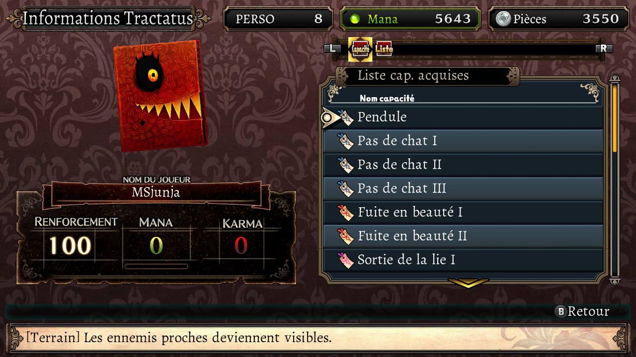 Une fois tout cela fait, vous aurez accès à la boutique comme aux améliorations de « tractie » vous permettant de vous faciliter l’aventure dans le labyrinthe grâce à divers pouvoirs et objets. Vous pourrez retrouver votre inventaire et les bonus dans le menu du Tractatus de Monstrum présent ci-dessous.