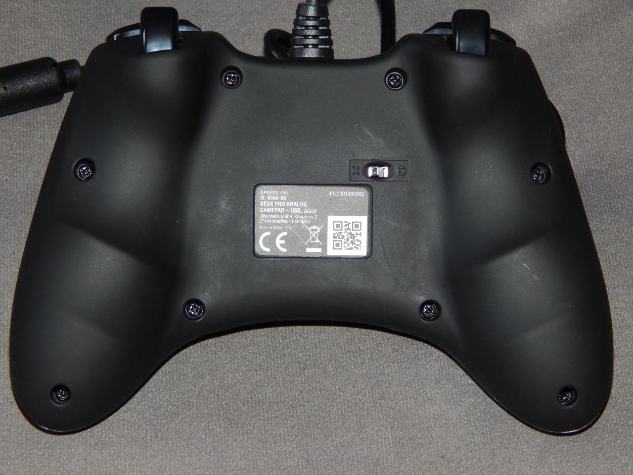 L‘interrupteur coulissant au dos vous permet de commuter entre les deux modes de la manette : « X » pour XInput (convient pour la plupart des jeux actuels) et « D » pour DirectInput (pour tous les jeux anciens et quelques jeux récents).