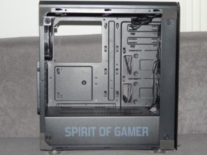 - En partie basse, la cage d’alimentation intégrale qui est munie du nom de la marque ( ici « Spirit Of Gamer ») , et d’ une ouverture qui permet le passage de câble.