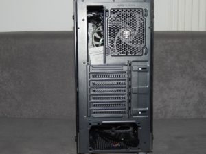 Sur la façade arrière, on retrouve notre emplacement pour I/O Shield afin de pouvoir mettre votre carte mère, un ventilateur RGB de 120mm, un emplacement pour ventilateur 120mm et 7 équerres PCI et l’emplacement de l’alimentation qui est situé en partie basse.