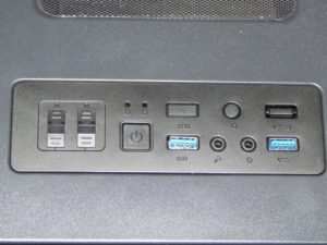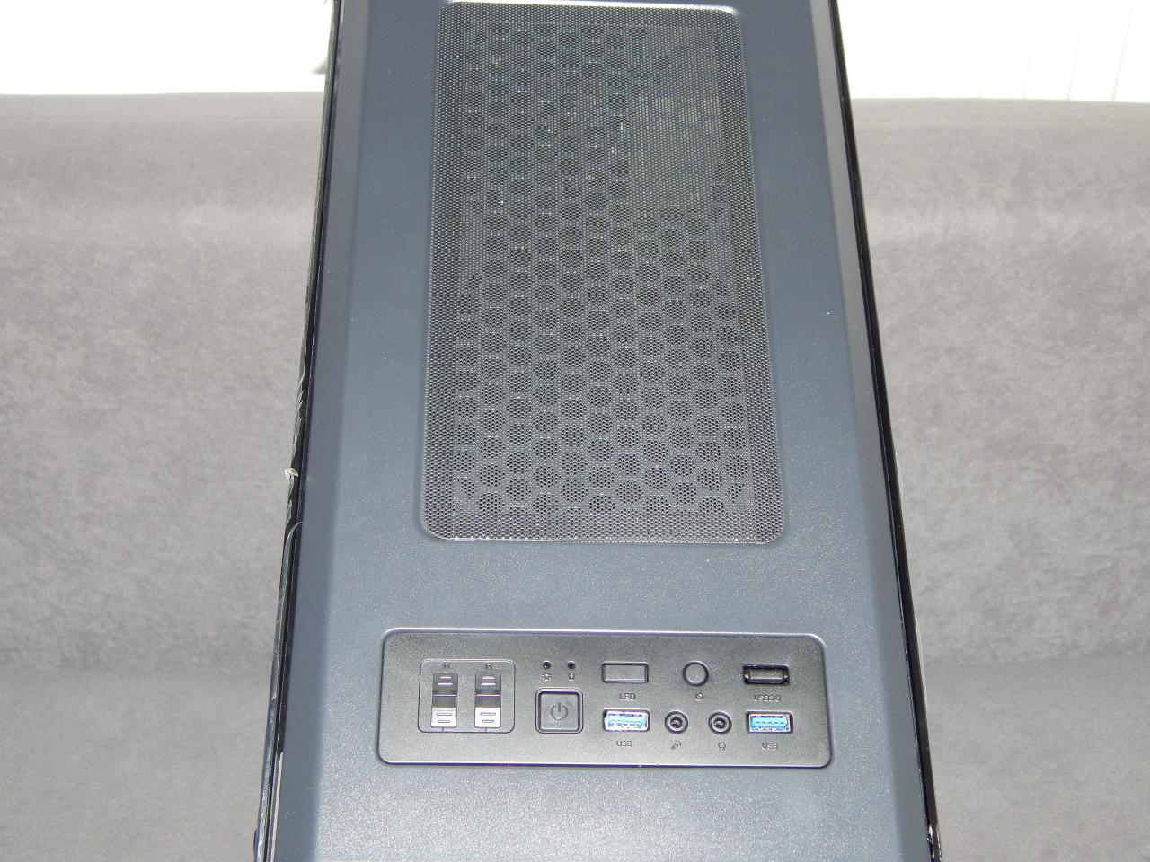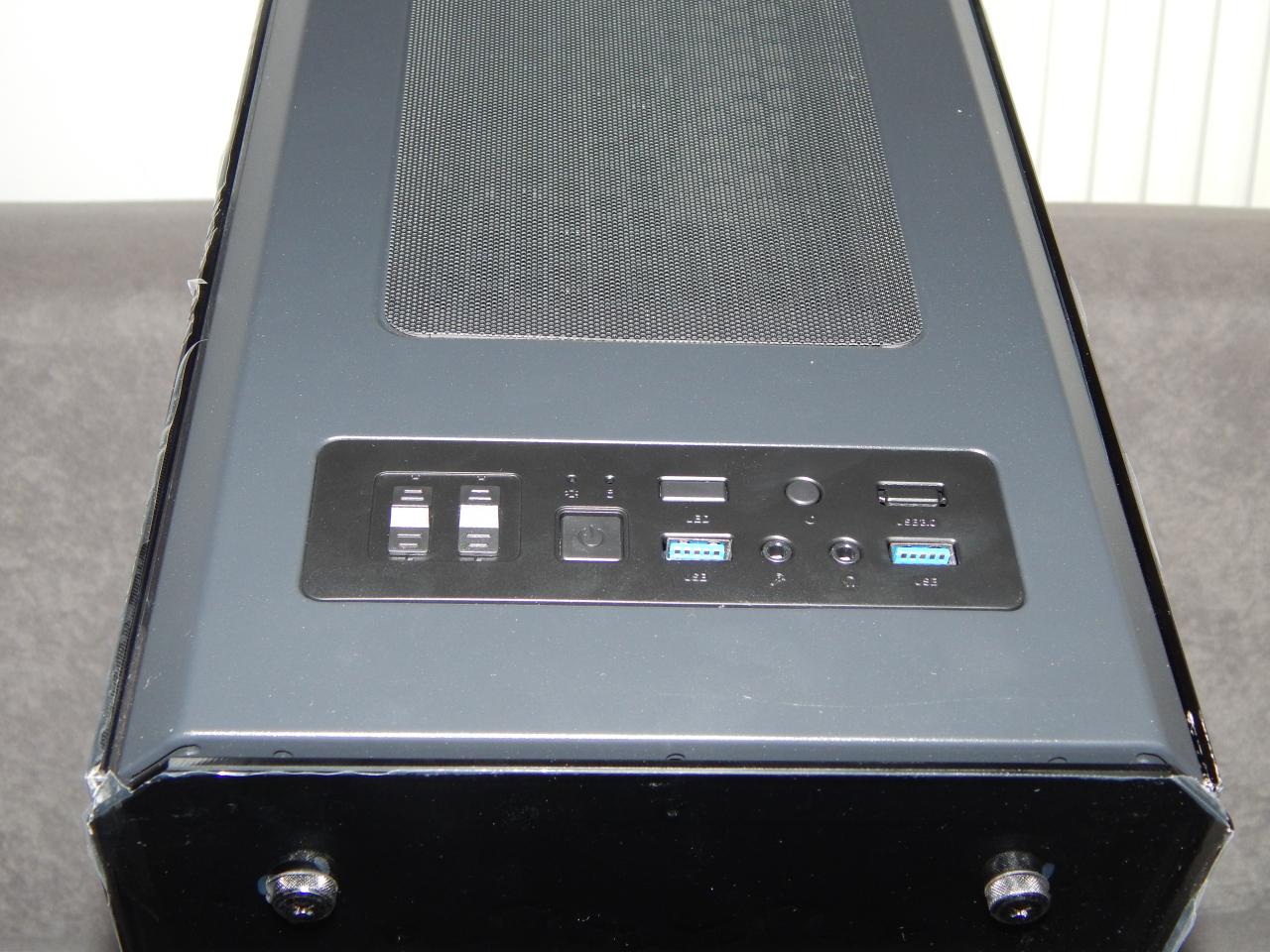 Sur le haut du boîtier, on retrouve le bouton Power on/off et un bouton Reset. Il y a également deux connectiques USB 3.0, deux jack (micro/casque), un bouton pour changer la couleur du RGB des ventilateurs ainsi que deux interrupteurs pour changer la vitesse de ventilation.