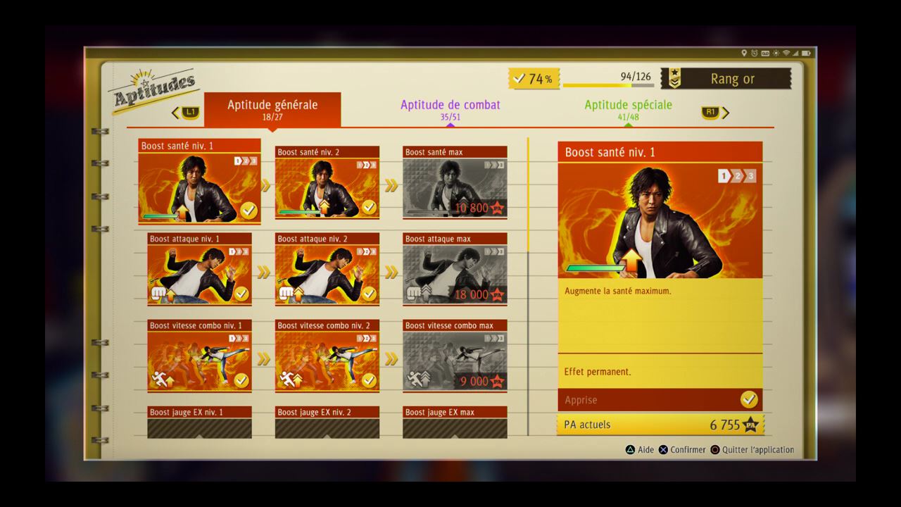 Bien évidemment, au fur et à mesure que vous avancerez dans le jeu, vous pourrez gagner de l’argent pour faire vos emplettes mais aussi des points d’aptitude qui vous permettront, par exemple, d’obtenir de nouvelles techniques de combat