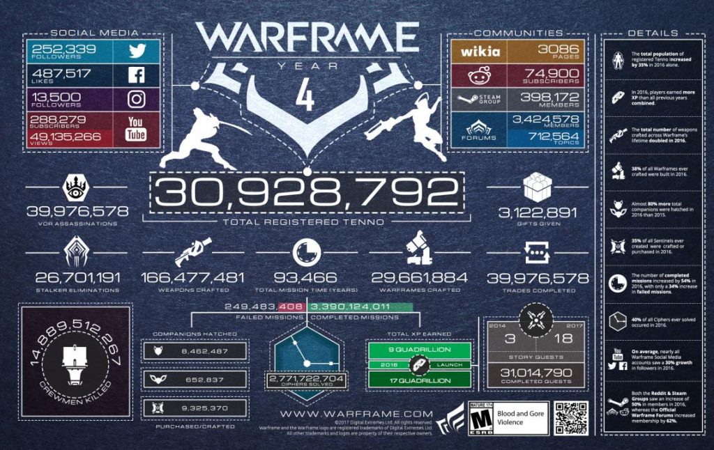 Avec plus de 30 millions d’utilisateurs enregistrés. C’est plus de 29 millions de Warframes créées, 3 milliards de missions complétées avec succès, 14 billions d’hommes d’équipage tués, et 17 billiards de points d’XP gagnés : ces quatre dernières années.
